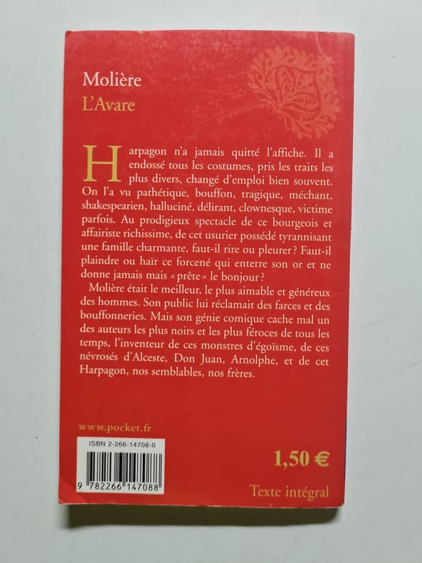 Larousse Sans date. L'Avare de Molière est une comédie de caractère qui met en scène Harpagon un vieil homme obsédé par son argent dont l'avarice extrême perturbe la vie de ses enfants et de son entourage. La pièce explore les conflits familiaux et les manœuvres amoureuses dans un contexte où l'argent domine toutes les relations