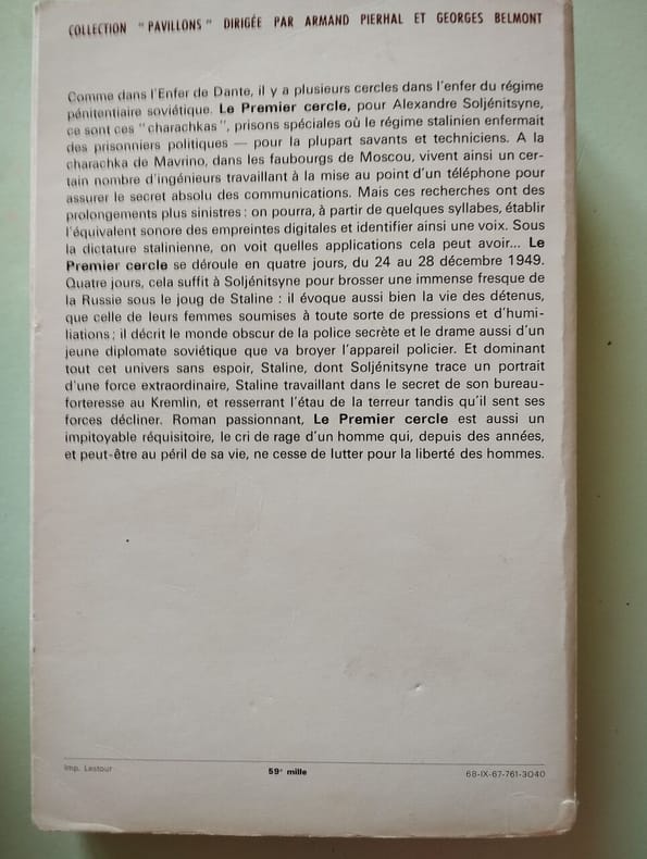 Traduit du russe par Henri-Gabriel Kybarthi. Uns des premiers romans publiés en france sur les prisons de Staline au lendemain de la grande guerre patriotique mais aussi sur la vie des Russes sous la tyrannie du régime communiste. En même temps qu'un roman pationnant, Le premier cercle est aussi un impitoyable réquisitoire, le cri de rage d'un homme qui lutte pour la liberté.