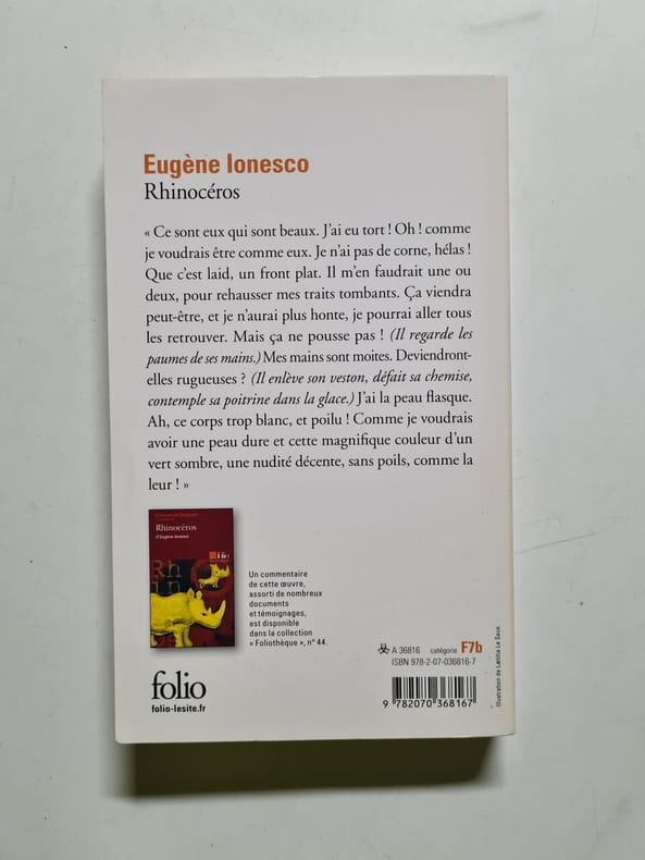 Ionesco. Rhinoceros. In French /Ionesco. Rhinoceros. France Gallimard 1973. We have thousands of titles and often several copies of each title may be available. Please feel free to contact us for a detailed description of the copies available. SKUalbfb4548fa07994e48.