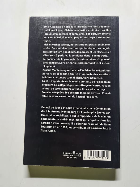 Denoël / Impacts 2000 250 pages 14cmx22 5cmx2 1cm. 2000. Broché. 250 pages. Une Assemblée nationale impuissante des dépenses publiques incontrôlables une justice arbitraire des élus locaux omnipotents et cumulards des gouvernements autistes une diplomatie opaque : les citoyens se sentent trahis.Vieilles vaches sacrées nos institutions paraissent inamovibles. Ce sont elles pourtant qui fabriquent ce dégoût croissant de la vie politique démoralisent les électeurs et détruisent à petit feu la confiance dans la démocratie. Au sommet de la pyramide la nature même du pouvoir présidentiel favorise l'inertie l'irresponsabilité et surtout l'impunité. Arnaud Montebourg raconte de l'intérieur les mécanismes pervers de ce régime épuisé et apporte des solutions inédites à la construction d'institutions nouvelles.La plus importante est la remise en cause de l'élection du Président de la République au suffrage universel rouage central de cette machine à trahir les espoirs du pays. Premier acte prévisible de cette thérapie de choc : l'inévitable mise en accusation de l'actuel Président