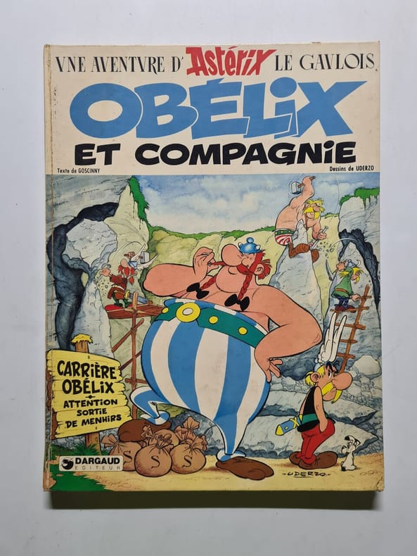 1976, Dargaud éditeur, in-4 cartonné de 48 pages, couverture et bande dessinée illustrées en couleurs, Astérix n°23, Obélix et compagnie, édition originale | Etat : assez bon état, couverture détachée (Ref.: J13239)
