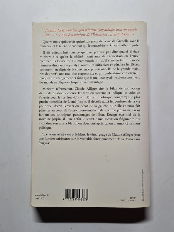 Robert Laffont 2000 320 pages in8. 2000. Broché. 320 pages. J'aurais pu être un bon gros ministre sympathique dont on aurait dit : " C'est un bon ministre de l'Education : il ne fait rien. "Quatre mois après avoir quitté son poste de la rue de Grenelle avec la franchise et le talent de conteur qui le caractérisent Claude Allègre parle.Il dit aujourd'hui tout ce qu'il ne pouvait pas dire quand il était ministre : ce qu'est la réalité inquiétante de l'éducation en France comment la lourdeur du " mammouth " - qu'il conviendrait mieux de nommer dinosaure - paralyse toutes les initiatives et pénalise les élèves comment en dépit de la conscience professionnelle de la grande majorité des profs une tradition corporatiste et un syndicalisme conservateur bloquent le changement et font que le meilleur système d'enseignement du monde se dégrade chaque année davantage.Ministre réformateur Claude Allègre tire le bilan de son action de modernisation dénonce les tares du système et indique les voies de l'avenir pour le système éducatif. Ministre politique longtemps le plus proche conseiller de Lionel Jospin il dévoile aussi les coulisses de la vie politique décrit l'envers du décor de la gauche plurielle et nous fait pénétrer au cœur de l'action gouvernementale comme jamais ne l'avait fait un des principaux personnages de l'Etat. Rouage essentiel de la machine Jospin il livre enfin le secret d'une ascension fulgurante qui a conduit son ami à Matignon deux ans après qu'on a annoncé sa mort politique.Opération vérité sans précédent le témoignage de Claude Allègre jette une lumière saisissante sur le véritable fonctionnement de la démocratie française