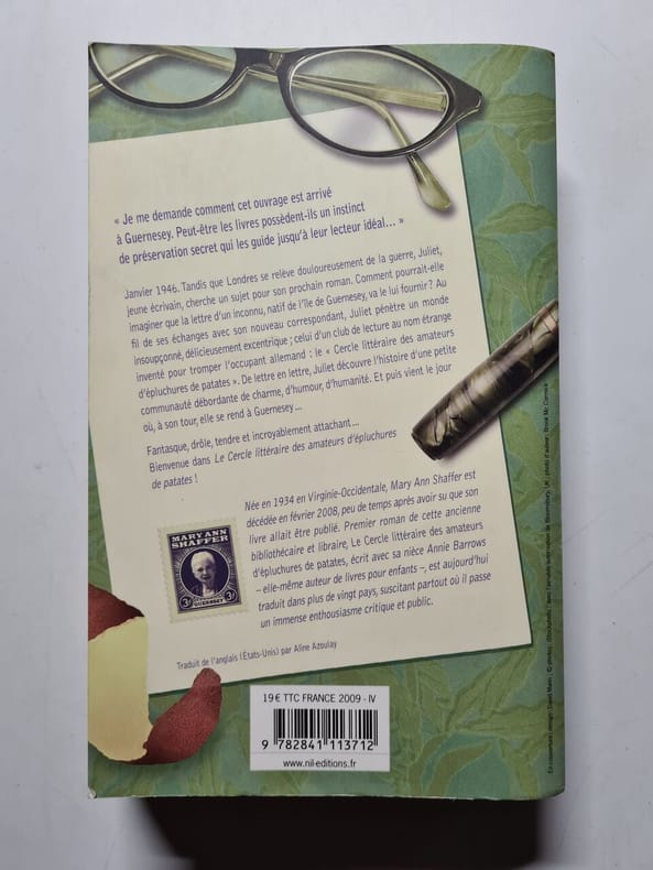 "Janvier 1946. Tandis que Londres se relève douloureusement de la guerre, Juliet, jeune écrivain, cherche un sujet pour son prochain roman. Comment pourrait-elle imaginer que la lettre d'un inconnu, natif de l'île de Guernesey, va le lui fournir ? Au fi l de ses échanges avec son nouveau correspondant, Juliet pénètre un monde insoupçonné, délicieusement excentrique ; celui d'un club de lecture au nom étrange inventé pour tromper l'occupant allemand : le "Cercle littéraire des amateurs d'épluchures de patates". De lettre en lettre, Juliet découvre l'histoire d'une petite communauté débordante de charme, d'humour, d'humanité. Et puis vient le jour où, à son tour, elle se rend à Guernesey..."