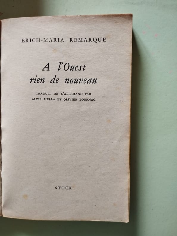 Édition originale française. Tirage à 600 ex n°. Un des 440 ex sur Alfa bouffant (après 110 pur fil du Marais). Bel exemplaire.* À l'ouest rien de nouveau (titre original allemand : Im Westen nichts Neues) est un roman de Erich Maria Remarque paru officiellement en 1929. Le roman décrit la Première Guerre mondiale vue par un jeune soldat volontaire allemand sur le front ouest. Symbole du pacifisme allemand, le roman devient rapidement un succès de librairie et est suivi par d'autres romans de Remarque de la même veine, comme Après et Trois camarades. L'auteur, pourchassé dès 1930 par les militants nazis en raison de son pacifisme, émigre en Suisse, puis aux États-Unis. Son livre fut brûlé lors des autodafés en Allemagne nazie le 10 mai 1933, trois mois après leur accession au pouvoir. Photos sur demande.