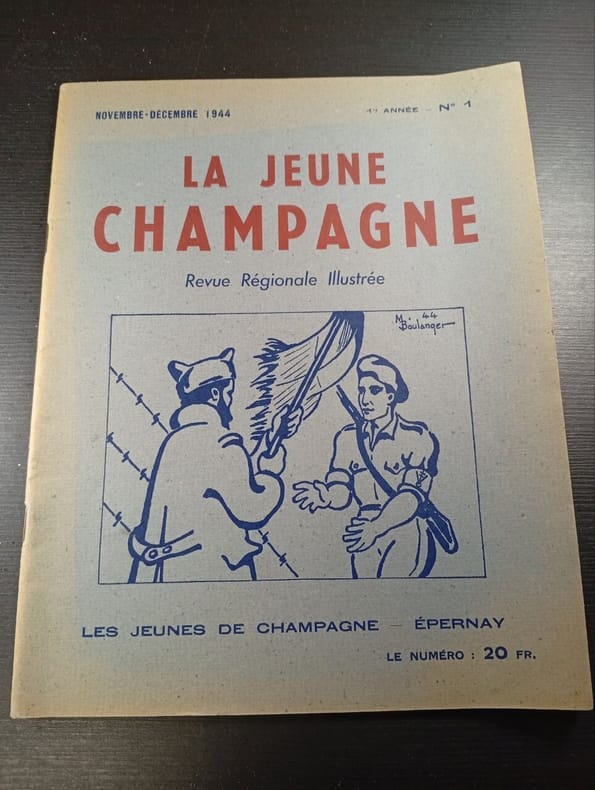 Les Jeunes de Champagne - Epernay Revue 1944 In-4 (21,2 x 27 cm), revue dos agrafé, 31 pages, illustrations en noir ; mouillure et rousseurs au premier plat, dos frotté, papier bruni, assez bon état général. Livraison a domicile (La Poste) ou en Mondial Relay sur simple demande.