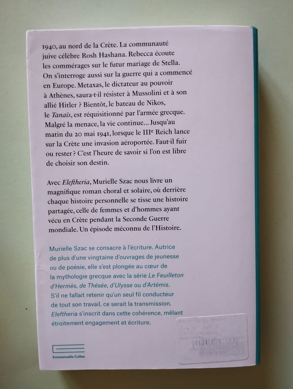 1940, au nord de la Crète. La communauté juive célèbre Rosh Hashana. Rebecca écoute les commérages sur le futur mariage de Stella. On s'interroge aussi sur la guerre qui a commencé en Europe. Metaxas, le dictateur au pouvoir à Athènes, saura-t-il résister à Mussolini et à son allié, Hitler ? Bientôt, le bateau de Nikos, le Tanaïs, est réquisitionné par l'armée grecque. Malgré la menace, la vie continue... Jusqu'au matin du 20 mai 1941, lorsque le IIIe Reich lance sur la Crète une invasion aéroportée. Faut-il fuir ou rester ? C'est l'heure de savoir si l'on est libre de choisir son destin. Avec Eleftheria, Murielle Szac nous livre un magnifique roman, choral et solaire, où derrière chaque histoire personnelle se tisse une histoire partagée, celle de femmes et d'hommes ayant vécu en Crète pendant la Seconde Guerre mondiale. Un épisode méconnu de l'Histoire Franco de port France jusqu'à 29 euros iclus. MONDIAL RELAY pour : FRANCE, Portugal, Pologne, Espagne, Allemagne, Autriche, Pays Bas, Luxembourg, Italie, Belgique. Toutes les étapes sont accompagnées. Achat, estimations et listages France / Suisse (sur rdv).