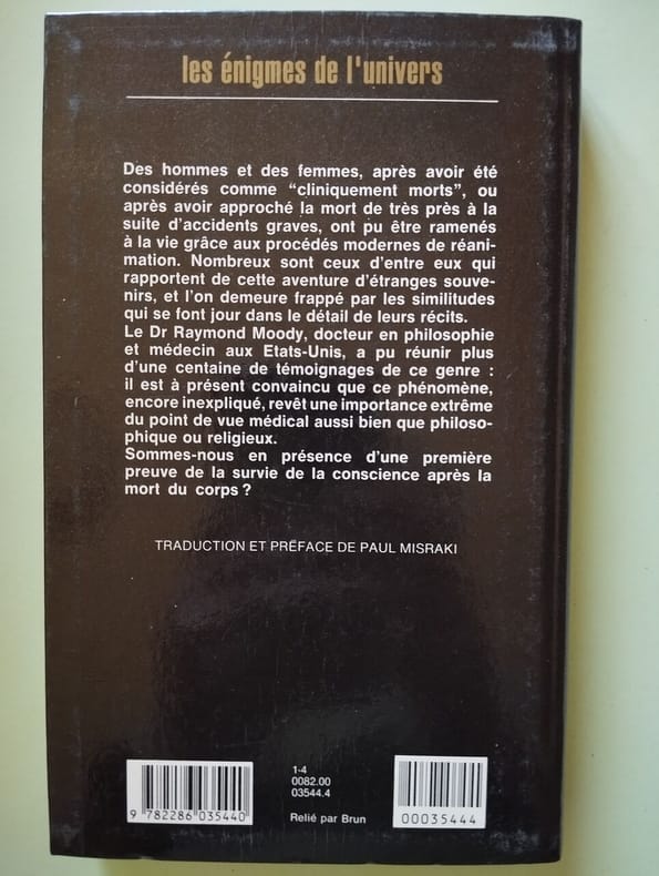 Robert Laffont 1978 180 pages in8. 1978. Broché. 180 pages. Qu'y a-t-il de l'autre côté ? Dans La vie après la vie Raymond Moody médecin et docteur en philosophie relatait l'expérience d'hommes et de femmes ayant connu la mort "clinique". Tous les témoignages concordaient : la sensation de flotter au-dessus de son propre corps le "tunnel" à traverser l'accession à un lieu de paix et de lumière. Et le retour à la vie - presque à regret... Aujourd'hui l'auteur approfondit son enquête et nous fait part de révélations plus étonnantes qui ouvrent des perspectives plus vastes encore. Message d'espoir aussi : tous ceux qui ont franchi l'ultime frontière sont revenus transformés. Leur vie a désormais un autre sens un autre but - l'amour d'autrui la paix et l'harmonie