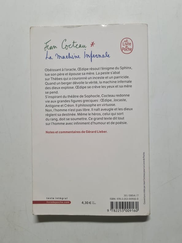 3 pages in-4 d'une écriture bien serrée, s.d. (1932). " Regarde, spectateur, remontée à bloc, de telle sorte que le ressort se déroule avec lenteur tout le long d'une vie humaine, une des plus belles parfaites machines construites par les dieux infernaux pour l'anéantissement mathématique d'un mortel ".Très beau document. Il s'agit d'un premier jet de l'acte III de la Machine infernale intitulé La Chambre nuptiale, il deviendra La Nuit de noces dans la version définitive. Il peut se lire comme le synopsis de cette scène dans laquelle Oedipe et Jocaste après la célébration de leur mariage sont dans la chambre d'amour, l'inceste ayant été consommé, " rouge comme une petite boucherie ". Il se déroule dans un climat de sensualité et de sommeil, les dialogues oscillent du duel au duo, du débat politique à l'ébat érotique… La Machine infernale, écrite en 1932 fut jouée pour la première fois le 10 avril 1934 à la Comédie des Champs-Élysées à Paris, théâtre alors dirigé par Louis Jouvet qui s'occupe de la mise en scène, dans des décors et des costumes de Christian Bérard. C'est Jean Cocteau lui-même qui prononce les paroles de la Voix; Jean-Pierre Aumont est Oedipe, Marthe Régnier Jocaste, Lucienne Bogaërt le Sphinx... La pièce se fonde sur Œdipe roi de Sophocle dont Cocteau avait déjà écrit une adaptation en 1925 qu'il reprendra dans l'acte IV. L'idée du premier acte s'inspire directement de celui d'Hamlet avec le fantôme de Laïus que personne ne voit ni n'entend. Mais la pièce garde une parfaite unité, en orchestrant avec une ampleur nouvelle, les thèmes et les procédés des précédentes pièces "antiques" de Cocteau. Le livre fut publié pour la première fois chez Grasset dans la collection "Pour mon plaisir" en 1934, il était illustré d'une suite de 16 dessins hors texte de Jean Cocteau intitulée "Le Complexe d'Oedipe". La même année Cocteau publie Mythologies avec 10 lithographies de Giorgio de Chirico.La pièce est dédiée " à Marie-Laure et à Charles de Noailles ". Les relations entre Cocteau et Marie-Laure de Noailles ont été souvent mouvementées et passionnelles. Elle aurait, dans un accès de colère, brûlé le manuscrit de La Machine infernale qui lui avait été offert.