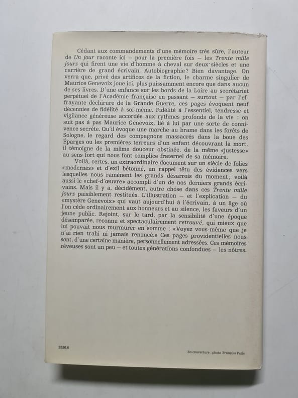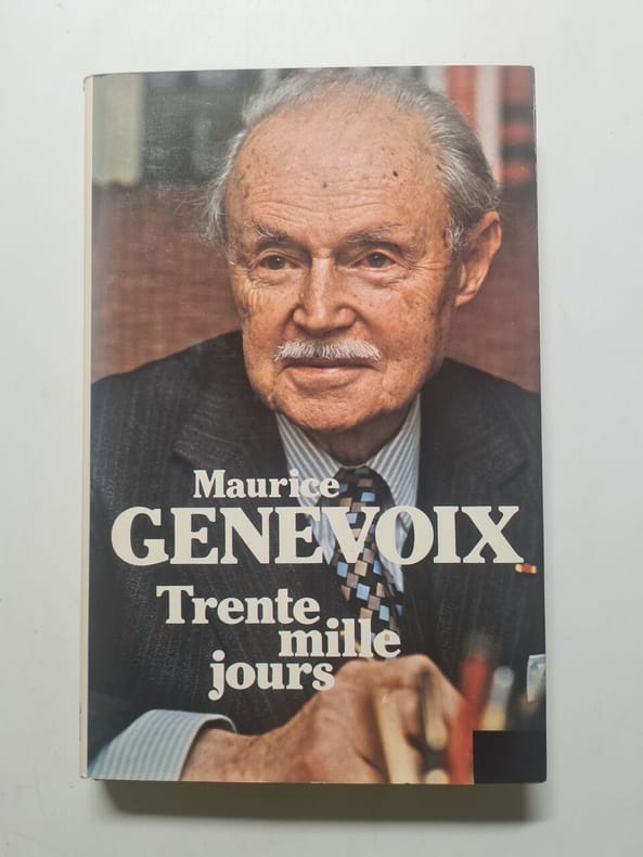 Dernier livre publié du vivant de Maurice Genevoix, Trente mille jours est un chef-d'oeuvre de mémoire, de lucidité et de transmission. Genevoix y parcourt les « trente mille jours » de sa vie, depuis son enfance ligérienne à Decize et Châteauneuf-sur-Loire, jusqu'à son accession au secrétariat perpétuel de l'Académie française, en passant par l'épreuve de la Grande Guerre. Une sincérité et une authenticité rares, alliées à une mémoire prodigieuse, qui font de son oeuvre un viatique exemplaire. Le 20 juin 1980, il est l'invité exceptionnel d'Apostrophes, où Bernard Pivot l'interroge sur ce livre. La guerre, bien évidemment, mais aussi la question de la langue, de ce don, ce charme, ce fluide qu'on lui prête : « C'est peut-être vrai, mais à la base de ça, il y la patience. La patience. La curiosité, mais il y a la patience. L'homme a toujours moins de patience que les animaux, mais il faut avoir une patience comparable à la leur, si vous y mettez le temps, vous arrivez à des choses extraordinaires». Cette autobiographie intellectuelle et sensible est le testament littéraire d'un homme resté fidèle à lui-même, fidèle à ses valeurs, à ses morts, à la nature et à l'écriture. Si un long et émouvant passage est consacré à la genèse et à la postérité de Raboliot, ce roman qui a bouleversé son destin, le texte porte le filigrane constant des récits de guerre et du poids de la mémoire. Le livre-témoignage de l'auteur. De la bibliothèque de Maurice Genevoix, aux « Vernelles », avec ex-libris.