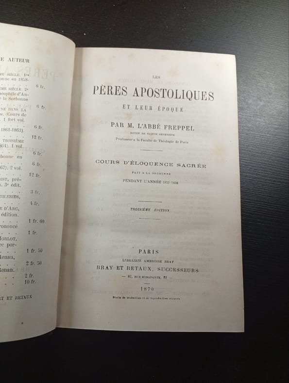 Ambroise Bray, Paris. 1859. In-8. Relié demi-cuir. Etat d'usage, Couv. légèrement passée, Dos frotté, Rousseurs. 475 pages. Titre et filets dorés sur le dos. Etiquette de code sur le dos. Plats frottés.. . . . Classification Dewey : 270-Histoire et géographie de l'Eglise