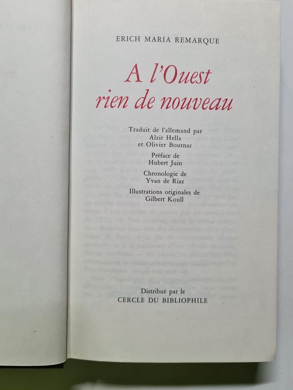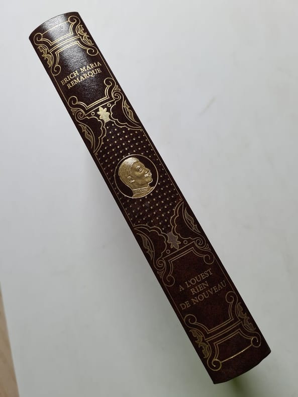 Édition strictement limitée à 2.200 ex sur papier pur fil des papeteries Outhenin Chalandre. N° 592. Bel exemplaire en parfait état.* À l'ouest rien de nouveau (titre original allemand : Im Westen nichts Neues) est un roman de Erich Maria Remarque paru officiellement en 1929 mais paru pour la 1ère fois en 19282. Le roman décrit la Première Guerre mondiale vue par un jeune soldat volontaire allemand sur le front ouest3. Symbole du pacifisme allemand, le roman devient rapidement un succès de librairie et est suivi par d'autres romans de Remarque de la même veine, comme Après et Trois camarades. L'auteur, pourchassé dès 1930 par les militants nazis en raison de son pacifisme, émigre en Suisse, puis aux États-Unis. Son livre fut brûlé lors des autodafés en Allemagne nazie le 10 mai 1933, trois mois après leur accession au pouvoir. Photos sur demande.