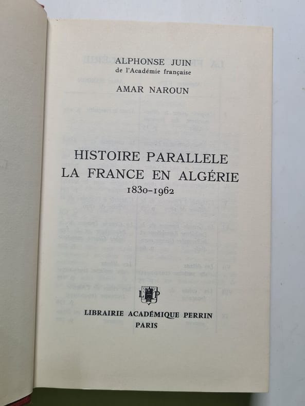 État : Bon état - Année : 1963 - Format : in 8° - Pages : 317pp - Editeur : Librairie Académique Perrin - Lieu d'édition : Paris - Type : Cartonnage toile éditeur, jaquette illustrée - Divers : La jaquette est un peu déchirée sur le premier plat en haut. les tranches sont légèrement insolées. - Commander rapidement : https://www.bons-livres.fr/livre/alphonse-juin-et-amar-naroun/2128-histoire-parallele-la-france-en-algerie-1830-1962?lrb
