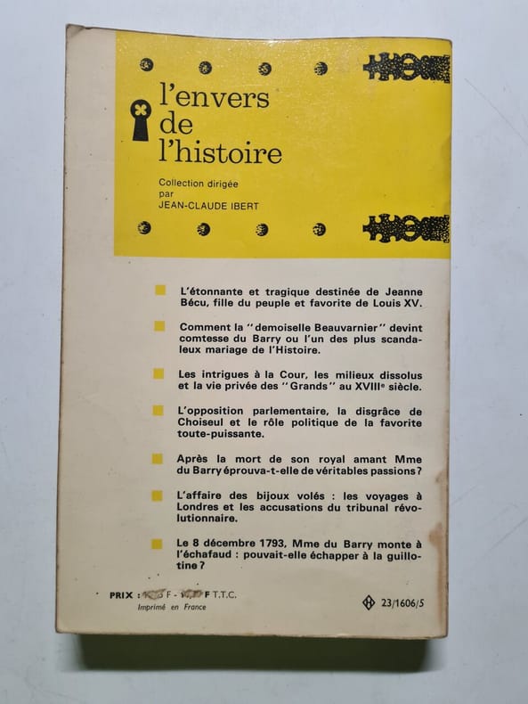 Jeanne Bécu de Cantigny, dite Mademoiselle de Vaubernier, devenue par son mariage comtesse du Barry, née le 19 août 1743 à Vaucouleurs en Lorraine et guillotinée à Paris le 8 décembre 1793, fut la dernière favorite du roi Louis XV. Son origine roturière et sa jeunesse agitée suscitèrent des pamphlets injurieux et même orduriers. — 1. Anecdotes sur Mme la comtesse du Barry : "C'est au mois de septembre 1775, et probablement à Londres que parut la première édition des Anecdotes sur la comtesse du Barry. Bien que l'ancienne favorite, déchue de ses grandeurs passées, vécût alors, exilée et comme prisonnière, à l'abbaye du Pont-aux-Dames, le souvenir de ses triomphes était trop récent pour que le livre ne fît point éclat. Il était, au reste, curieux, plein de renseignements précis mêlés de gravelures. Comme par-dessus la tête de la maîtresse, il atteignait très directement le roi défunt et ne se pouvait vendre que sous le manteau, le danger de le posséder accrut encore son succès..." (Introduction) — 2. De l'exil à l'échafaud : "Cette dernière partie est empruntée aux “Mémoires historiques de Jeanne Gomart de Vaubernier, comtesse du Barry, rédigés sur des pièces authentiques par M. de Favrolle”, publiés chez Lerouge en l'an XI. Ces mémoires ont pour auteur la baronne Brossin de Méré. Née à Paris, en 1751, Mme de Méré publia de 1794 à 1829, année de sa mort, sous son nom de jeune fille (Elisabeth Guénard) ou sous divers pseudonymes (A. L. de Boissy, J. H. F. de Geller, de Favrolle), cent dix ouvrages, romans, mémoires historiques et contes galants dont on trouvera le détail dans l'excellente notice que Quérard a consacrée à cet auteur. “Les Mémoires de Madame du Barry”, dont les deux premiers volumes reproduisent à peu près “les Anecdotes” de Pidansat de Mairobert, sont la source unique où ont puisé tous les biographes de la favorite. Les historiens n'ont même, à l'exception de M. C. Vatel, rien ajouté, ou presque, à ce premier fonds : c'est une justice qu'il convient de rendre à la baronne de Méré qu'elle a connu et utilisé adroitement tous les documents essentiels de l'époque révolutionnaire concernant Mme du Barry."