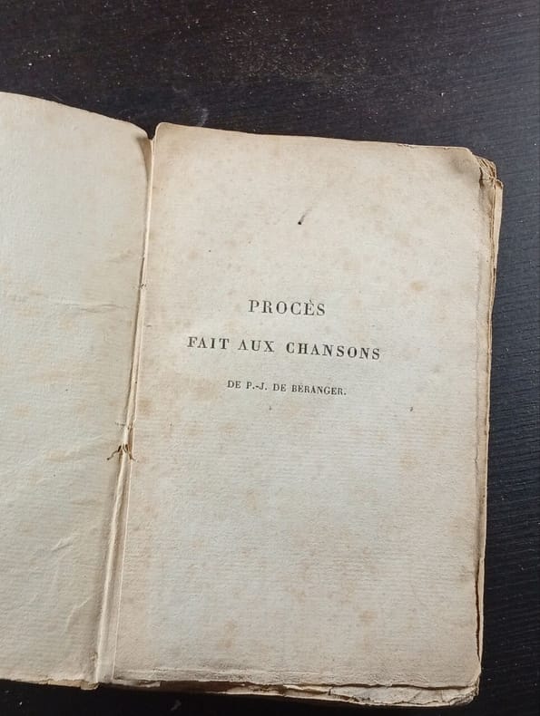 1821 Paris, chez les Marchands de Nouveautés, Décembre 1821. Paris, Baudouin frères, 1822. In-18 de 188 pages pour le premier ouvrage et 67 pages pour le second. Edition originale.in12, demi veau,doslisse orn, pièce de titre maroquin vert, titre doré, . Les "Chansons" de Béranger furent poursuivies par le parquet qui requérait la condamnation de l'auteur. Béranger comparut devant les Assises le 8 décembre 1821 et fut condamné à trois mois de prison et 500 francs d'amende pour seulement neuf chansons. La relation de ce procès qui du reste l'amena de nouveau devant les Assises et où cette fois il fut acquitté a été publiée par ses soins. Vicaire.