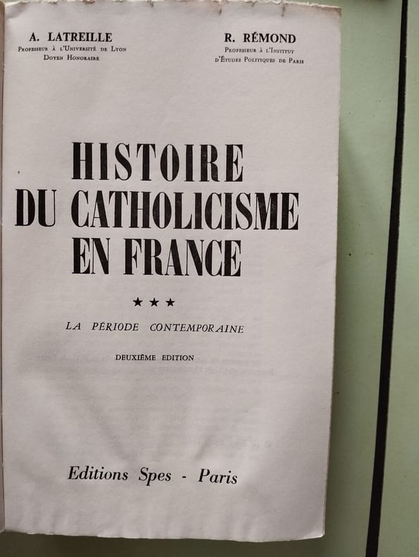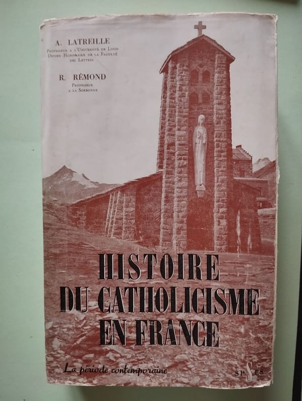 Tome III seul (sur 3) : De la fin de l'Ancien Régime à 1958. — "Le troisième et dernier tome de la monumentale Histoire du catholicisme en France dont André Latreille a conçu le plan et écrit lui-même presque toute la partie contemporaine, à l'exception des ultimes chapitres confiés à René Rémond, pourrait porter en sous-titre "les Illusions perdues". Toute une série de drames douloureux et plus rarement d'heureuses surprises sont nés en effet de la méconnaissance du réel, soit entre la France et Rome, soit à l'intérieur de notre pays entre croyants et incroyants, durant ces deux siècles dont l'histoire religieuse est ici abordée avec une telle largeur de vues, un tel souci d'équité, que la science historique en offre peu d'exemples sur des sujets aussi brûlants. Illusion d'avoir pensé que le philosophisme du dix-huitième siècle avait profondément entamé la foi du peuple des villes et des campagnes ; illusion des évêques gallicans d'avoir cru que Pie VI pourrait jamais accepter, même avec certains tempéraments, la constitution civile du clergé, ou Grégoire XVI le libéralisme en quoi Lamennais et ses amis voyaient un moyen de renforcer l'action de l'Église sur les âmes ; double équivoque encore au début de 1848 d'avoir supposé que les timides réformes de Pie IX présageaient son ralliement à l'idée de l'indépendance italienne sous forme de confédération ou a fortiori d'État unitaire, et, en France, que l'euphorie de février amènerait une compréhension profonde des aspirations de la classe ouvrière de la part de la bourgeoisie catholique et du clergé ; lorsque à la fin du Second Empire l'athéisme et le scientisme des milieux intellectuels semblent avoir définitivement triomphé de l'inquiétude religieuse, que le Syllabus a braqué centre Rome tous les libres penseurs et que cette fois de larges couches populaires se détachent de l'Église ; erreur aussi chez les républicains et les socialistes oui tiendront solidement les majorités parlementaires après le bref interrègne d'une Assemblée nationale monarchiste d'avoir escompté le discrédit définitif des dogmes et le triomphe durable du positivisme. Refus d'autoriser la survie des congrégations, rupture des relations diplomatiques avec le Vatican, abandon du concordat, spoliation des biens ecclésiastiques : autant de succès du radicalisme et du combisme dont on voit aujourd'hui le caractère éphémère..." (Maurice Vaussard, Le Monde, 21 juin 1962)