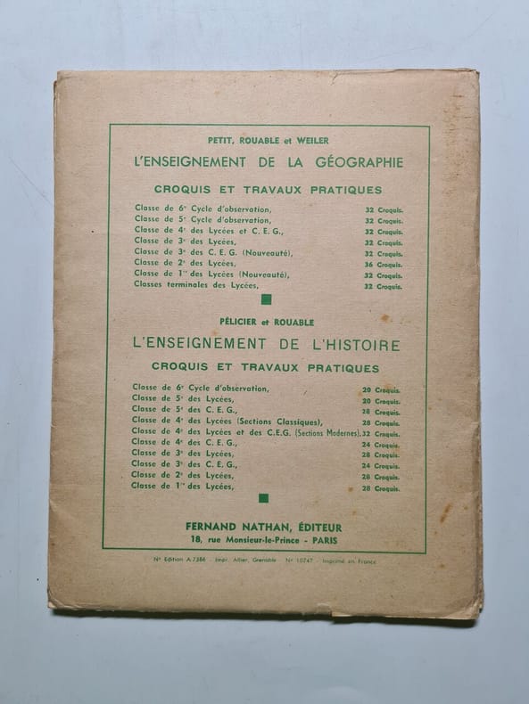 Fernand Nathan. 1968. In-8. En feuillets. Etat d'usage, Couv. légèrement passée, Dos satisfaisant, Intérieur acceptable. 36 croquis en feuillets sous chemise souple - quelques croquis ont été coloriées au crayon de couleur - rousseurs sur la chemise.. . . . Classification Dewey : 372.89-Livre scolaire : histoire / géographie