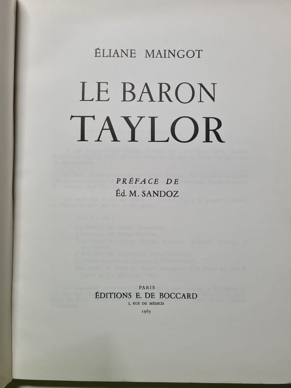La statue de Taylor (1789-1879), réalisée par Gabriel-Jules Thomas, a été inaugurée le 15 mai 1884 au cimetière du Père-Lachaise, à Paris. L'opuscule réunit les discours prononcés à cette occasion par M. de Sommerard, président de l'association des artistes peintres... ; M. Halanzier, président de l'association des Artistes dramatiques ; Arsène Houssaye et Charles Diguet, de la Société des gens de Lettres ; Eugène Guillaume, président de l'Académie des Beaux-arts ; M. Kaempfen, directeur des Beaux-Arts.