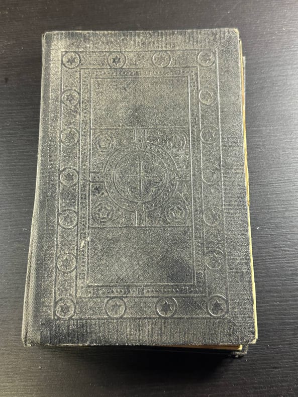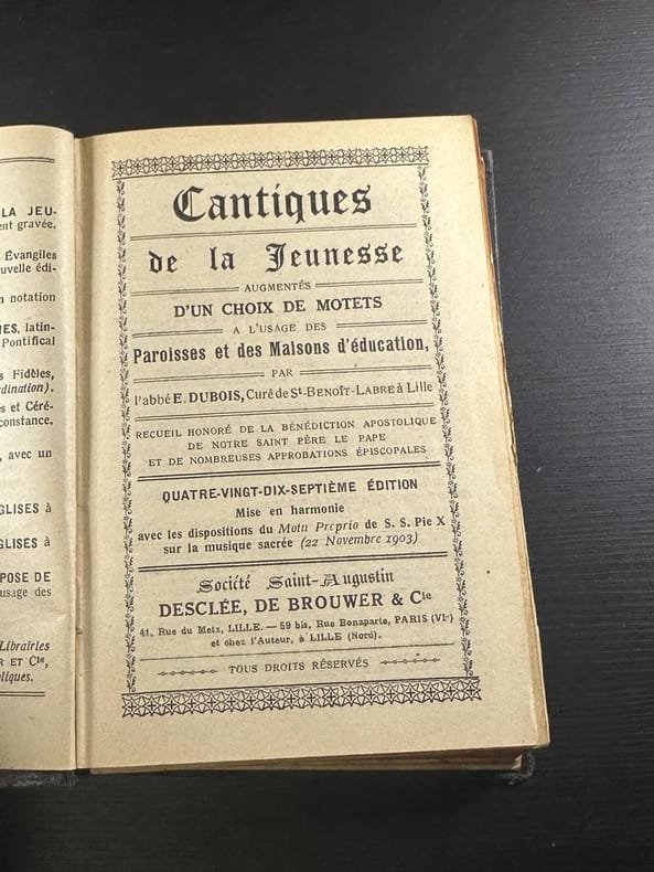 Arras Brunet 1903 1 Un volume de format in 12 de 308 pp. suivi de 60 pp.; "Kyriale ou Chants Ordinaires de la Messe" édition Desclée de Brouwer. Reliure de l'éditeur en pleine percaline noire, estampée; titre doré mais effacé au dos; tranches rouges. Ouvrage entièrement consacré aux partitions avec les textes joints.