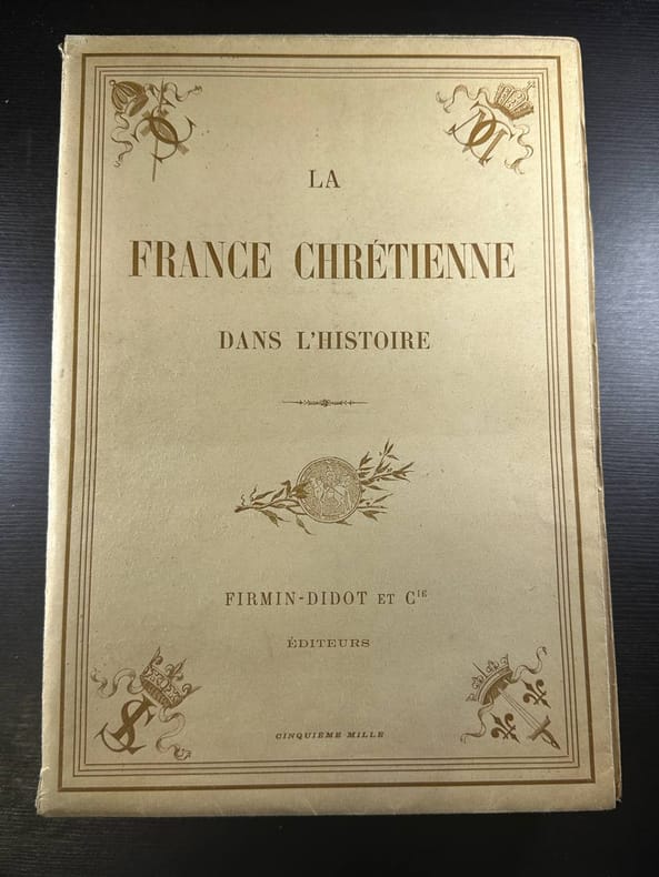 LA FRANCE CHRÉTIENNE DANS L'HISTOIRE ouvrage publié à l'occasion du 14e centenaire du baptême de Clovis. édition illustrée, reliure orné de fleurons dorés et monogrammes. vol.in-4, 290x210, relié demi cuir, dos à nerfs, toutes tranches dorées, très bel état intérieur, 683pp Paris, Firmin Didot, 1896