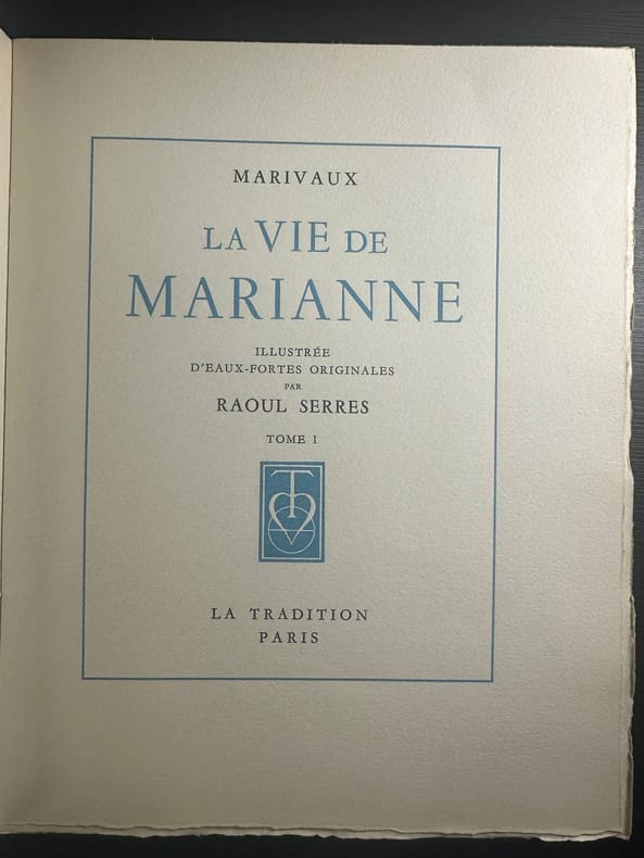 Stock Paris 1947 Fort in-12 broché.598 pages.Couverture rempliée.La vie de Marianne avec la suite de Marianne par Madame Ricoboni.Préface de Marcel Arland.Ouvrage orné en frontispice d'une pointe sèche de Michel Ciry et de bandeaux de Mario Prassinos.Exemplaire numéroté sur Vélin Chiffon du Marais.Non coupé, bel exemplaire.