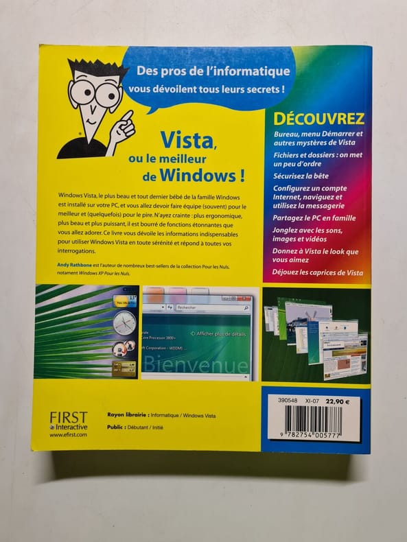 2e édition / Le bureau Vista - Contrôler les applications et gérer la mémoire / Fichiers et dossiers / Utiliser les applications intégrées à Vista - Le volet Windows et les gadgets - Accéder à internet - Surfer - Configure le matériel et les réseaux - Personnaliser le bureau - Sécurité/maintenance - La résolution des problèmes courants - Jeux et divertissements Classification Dewey : 4-Traitement des données. Informatique
