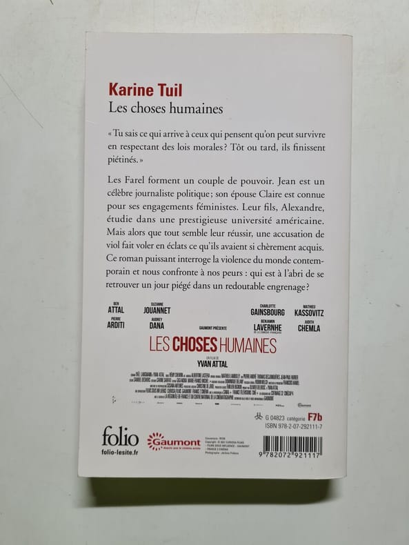 Folio Sans date. Les Choses humaines est un roman de Karine Tuil qui explore les conséquences d'une accusation de viol entre deux adolescents issus de milieux sociaux différents. L'œuvre démonte la mécanique judiciaire et interroge les zones grises du consentement tout en examinant les impacts sur les familles impliquées. Le livre a reçu le prix Interallié et le prix Goncourt des lycéens en 2019