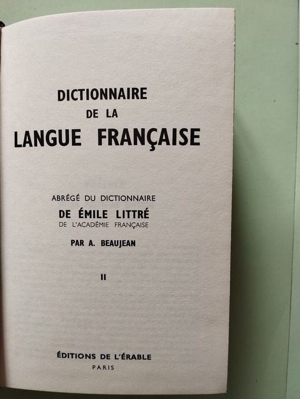 Contenant pour la nomenclature: tous les mots qui se trouvent dans le dictionnaire de l'Académie Française et tous les termes usuels des sciences, des arts des métiers et de lavie pratique; pour la grammaire: la prononciation de chaque mot figurée et , quand il y a lieu, discutée, l'examen des locutions, des idiotismes, des exceptions et, en certains acs, de l'orthographe actuelle, avec des remarques critiques sur les difficultés et les irrégularités de la langue; pour la signification des mots: les définitions, les diverses acceptions rangées dans leur ordre logique, avec de nombreux exemples tirés des auteurs classiques et autres, les synonymes principalement considérés dans leurs relations avec les définitions; pour la partie historique: une coolection de phrases appartenant aux anciens écrivainsdepuis les 1ers temps de la langue française jusqu'au 16è siècle, et disposées dans l'ordre chronologique à la suite des mots auxquels elles se rapportent; pourl'étymologie: la détermination ou du moins la discussion de l'origine de chaque mot établie par la comparaison des mêmes formes dans le français, dans les patois et dans l'espagnol, l'italien, le provençal ou la langue d'oc. Classification Dewey : 443-Dictionnaire français