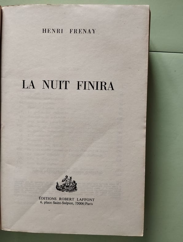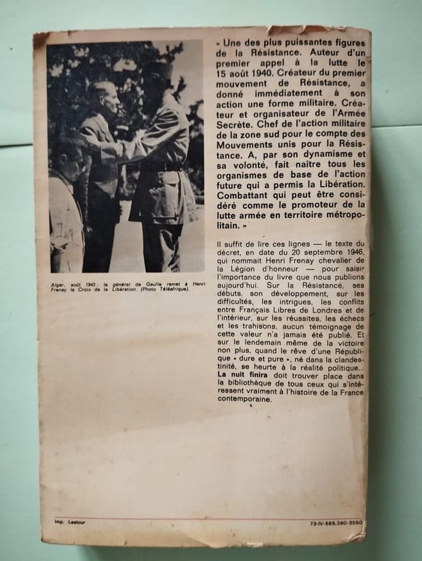 15 juillet 1940. Après s'être évadé, Henri Frenay arrive en zone libre. Pour tous, ou presque, la défaite de la France est irrémédiable. Pour lui, il en est sûr et il le veut, "la nuit finira". L'aventure de la Résistance commence. Personne avant lui n'a raconté comment a pu naître, se développer et agir un Mouvement de Résistance. Comment, à partir de la volonté d'un homme seul, les moyens ont été réunis, les méthodes arrêtées pour faire face à une situation sans précédent dans l'Histoire de la France ; pour créer cet organisme complexe que fut "Combat", ce mouvement que les historiens désignent comme ayant été le plus important, celui dont l'organisation servit de modèle aux autres. Difficultés, intrigues, conflits naissent à chaque pas entre Français de Londres et de l'intérieur, mais aussi entre Français et Alliés. Après trois ans de clandestinité, Henri Frenay devient ministre des Prisonniers, Déportés et Réfugiés dans le Gouvernement provisoire, d'abord à Alger puis à Paris. Tout en accomplissant sa nouvelle tâche, Henri Frenay pense que le rôle de la Résistance ne se terminera pas avec le dernier coup de canon. Parviendra-t-elle à édifier cette République "dure et pure" à laquelle ses chefs ont si passionnément aspiré ? Nous sommes conduits ainsi jusqu'en novembre 1945, date à laquelle le Gouvernement provisoire remet ses pouvoirs à l'Assemblée constituante et où Henri Frenay quitte la vie publique. La nuit finira, outre les nombreuses révélations qu'elle apporte, représente une contribution importante à l'histoire de la Résistance française. — « Une des plus puissantes figures de la Résistance. Auteur d'un premier appel à la lutte le 15 août 1940. Créateur du premier mouvement de Résistance, a donné immédiatement à son action une forme militaire. Créateur et organisateur de l'Armée Secrète. Chef de l'action militaire de la zone sud pour le compte des Mouvements unis pour la Résistance. A, par son dynamisme et sa volonté, fait naître tous les organismes de base de l'action future qui a permis la Libération. Combattant qui peut être considéré comme le promoteur de la lutte armée en territoire métropolitain. » Il suffit de lire ces lignes – le texte du décret en date du 20 septembre 1946, qui nommait Henri Fresnay chevalier de la Légion d'honneur – pour saisir l'importance du livre que nous publions aujourd'hui. Sur la Résistance, ses débuts, son développement, sur les difficultés, les intrigues, les conflits entre Français Libres de Londres et de l'intérieur, sur les réussites, les échecs et les trahisons, aucun témoignage de cette valeur n'a jamais été publié. Et sur le lendemain même de la victoire non plus, quand le rêve d'une République « dure et pure », né dans la clandestinité, se heurte à la réalité politique... (L'Editeur)