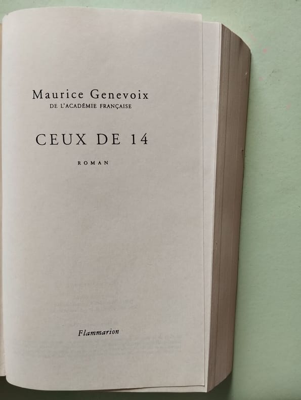 Ceux de 14 rassemble les récits de guerre de Maurice Genevoix. Rappelons que, jeune normalien, Maurice Genevoix intègre en septembre 1914 le 106e régiment d'infanterie et part combattre en Argonne, notamment à la Tranchée de Calonne : il y est grièvement blessé six mois plus tard, le 25 avril 1915 de trois balles, deux au bras et une à la poitrine. Après sept mois de soins, il rentre à Paris, rue d'Ulm et, sous les encouragements du secrétaire général de l'École normale supérieure, Paul Dupuy, avec qui il avait longuement correspondu pendant l'enfer de ces six mois, il accepte de relater son expérience du front et publie Sous Verdun, en avril 1916. Suivront Nuits de guerre, en mai 1917, Au seuil des guitounes, en septembre 1918, La Boue, en février 1921, et enfin Les Éparges, en septembre 1921 : une oeuvre à la fois historique et littéraire qui figure au premier rang des témoignages publiés sur la Grande Guerre. Intéressant exemplaire de travail considérablement annoté, en vue à la fois d'une lecture publique et pour la nouvelle édition Flammarion, qui interviendra, dans une version cartonnée, en 1965. Le texte sera lu pour la section qui narre l'assaut sur la butte des Éparges. De Ceux de 14, Maurice Genevoix avait conservé le manuscrit original (aujourd'hui à la BnF), deux exemplaires de travail et plusieurs exemplaires de l'édition originale dans son bureau-bibliothèque des «Vernelles», sa demeure sur les bords de Loire, près d'Orléans. Mention de mille en couverture. De la bibliothèque de Maurice Genevoix, aux « Vernelles », avec ex-libris.