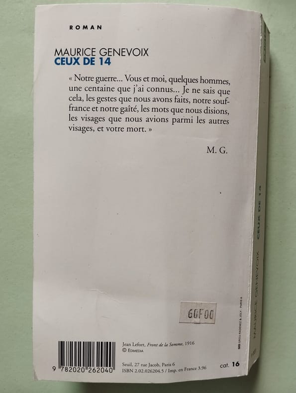 Ceux de 14 de Maurice Genevoix chez G. Durassié & Cie, Éditeurs en 1953. Le livre est illustré par André Lagrange. Le livre mesure 15x21 cm et pèse 0,800 kg (c) pour 334 et 354 pages. Reliure d'éditeur souple, Broché. Le livre est en très bon état, quelques traces de colle de scotchs.
