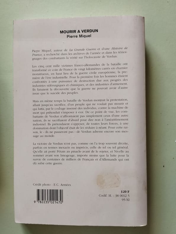 mourir à Verdun. In 8 cartonné souple, couverture illustrée. Faux-titre, titre, 315 pages, 1 page de table des matières, cartes ; Tallandier novembre 1995. Très bon état La Grande Guerre in 8 broché, couverture à rabats illustrée en couleur. Faux-titre, titre, 663 pages, 1 page de table des matières, cartes dans le texte. Fayard 6 octobre 1983. Très bon état 14-18 mille images inédites in 4 cartonné jaquette illustrée en couleurs 288 pages, 10 pages d'autochromes, sur fond noir, en fin de volume. Editions du Chêne Octobre 1988.