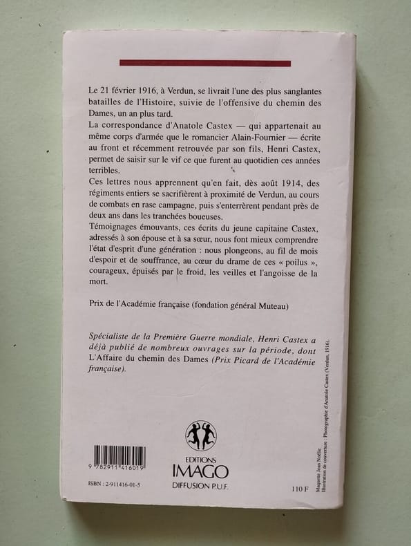 Correspondance du père de l’auteur, Anatole Castex, sous-officier au 288e R.I., à sa famille. — "Le 21 février 1916, à Verdun, se livrait l'une des plus sanglantes batailles de l'Histoire, suivie de l'offensive du chemin des Dames, un an plus tard. La correspondance d'Anatole Castex – qui appartenait au même corps d'armée que le romancier Alain-Fournier – écrite au front et récemment retrouvée par son fils, Henri Castex, permet de saisir sur le vif ce que furent au quotidien ces années terribles. Ces lettres nous apprennent qu'en fait, dès août 1914, des régiments entiers se sacrifièrent à proximité de Verdun, au cours de combats en rase campagne, puis s'enterrèrent pendant près de deux ans dans les tranchées boueuses. Témoignages émouvants, ces écrits du jeune capitaine Castex, adressés à son épouse et à sa sœur, nous font mieux comprendre l'état d'esprit d'une génération : nous plongeons, au fil de mois d'espoir et de souffrance, au cœur du drame de ces "poilus", courageux, épuisés par le froid, les veilles et l'angoisse de la mort."