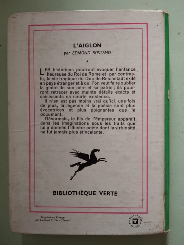 Paris Eugène Fasquelle Sans date. 262 pp. In-12. Relié. En bon état. 1 volume. 314ème mille.L'Aiglon est un drame d'Edmond Rostand écrit en 1900 et représenté pour la première fois à Paris, au théâtre Sarah-Bernhardt, le 15 mars 1900. « L'Aiglon » désigne le fils de Napoléon Ier (l'Aigle) et de Marie-Louise d'Autriche, également connu sous les noms de roi de Rome, de Napoléon II, de duc de Reichstadt. Dans ce drame en six actes, écrit en alexandrins, l'Aiglon, fils de Napoléon, cherche qui il est par rapport à son père, et cherche à marcher dans ses traces et ne pas être « un front qui se colle à des vitres ».Parmi les scènes remarquables, on peut noter la dernière scène de l'acte III.