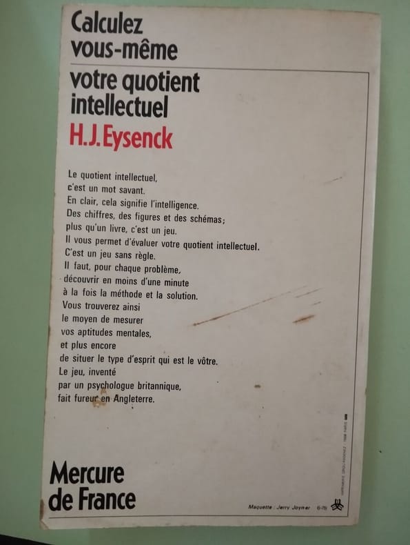 nombreuses figures dans le texte en noir et blanc 1ere traduction en francais, 1973 Contents, Chapitres : Introduction : Quotient intellectuel et mesure de l'intelligence - Comment mesurer votre propre Q.I. - 8 tests avec leurs solutions - Comment calculer le Q.I. - Hans Jürgen Eysenck, né à Berlin le 4 mars 1916 et mort à Londres le 4 septembre 1997, est un psychologue britannique d'origine allemande, connu pour son travail sur la personnalité, l'héritabilité de l'intelligence, les thérapies comportementales et pour ses critiques de la psychanalyse. Au moment de sa mort, Eysenck était le psychologue vivant le plus souvent cité dans les revues scientifiques anglophones. - Eysenck a été professeur de psychologie à l'Institut de Psychiatrie Institute of Psychiatry, King's College (un collège constituant de l'Université fédérale de Londres), de 1955 à 1983. Il fut un contributeur majeur à la théorie scientifique moderne de la personnalité et un brillant professeur qui a aidé à découvrir des traitements de maladies mentales. Il fut le rédacteur en chef du journal Personality and Individual Differences, et est l'auteur d'environ 80 livres et de plus 1600 articles de revues. Son fils Michael Eysenck est également un professeur de psychologie reconnu. Hans Eysenck est décédé d'une tumeur du cerveau dans un hospice de Londres en 1997. - C'est aussi l'un des signataires de la tribune Mainstream Science on Intelligence qui affirme le rôle du quotient intellectuel dans la vie humaine et l'existence de différences intellectuelles entre groupes humains qui ne découlent pas exclusivement de différences environnementales. D'une manière générale, les travaux de Hans Eysenck sont très critiques envers la psychanalyse: « rien de ce qui est nouveau dans la psychanalyse nest vrai, rien de ce qui est vrai dans la psychanalyse nest nouveau ». Ils susciteront de nombreux commentaires et controverses chez les partisans de cette technique psychothérapeutique. (source : Wikipedia) couverture à peine jaunie, avec d'infimes traces de pliures aux coins des plats, sinon bon état, intérieur frais et propre - nb : Grand format de la première traduction de 1973 au Mercure de France
