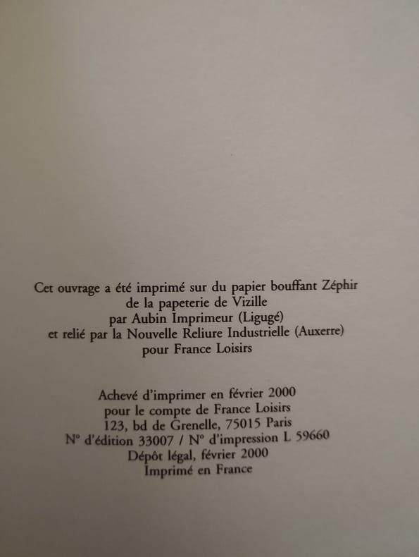 FRANCE LOISIRS. 2000. In-12. Relié. Bon état, Couv. convenable, Dos satisfaisant, Intérieur frais. 392 pages - signet conservé. Avec Jaquette. . . Classification Dewey : 840.092-XXI ème siècle