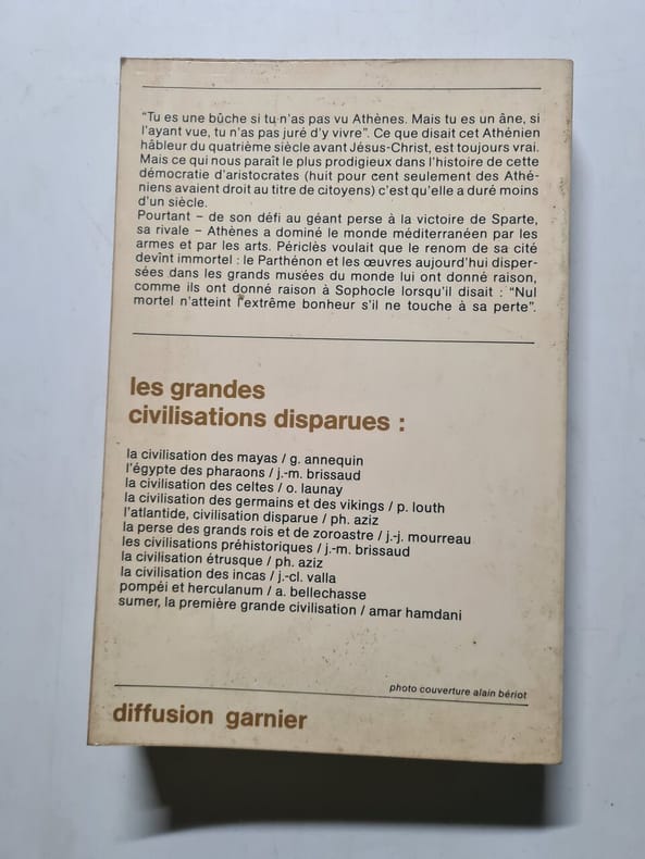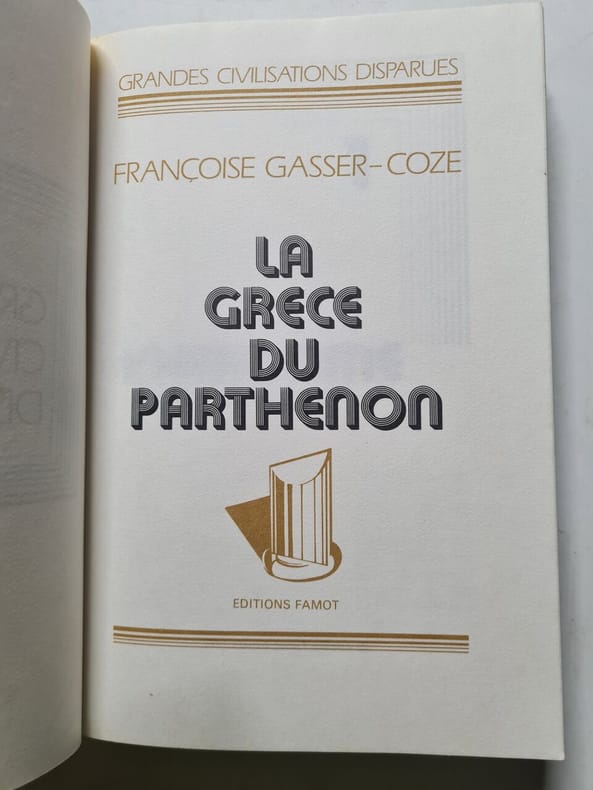 Editions Famot 299 pages in8. Sans date. reliure éditeur pages supérieurs dorées. 299 pages. Ouvrage documentaire de 1976 appartenant à la collection 'Grandes civilisations disparues' consacré à la Grèce antique à l'époque du Parthénon. Le livre présente de nombreuses illustrations et aborde probablement l'histoire l'art et l'architecture de cette période