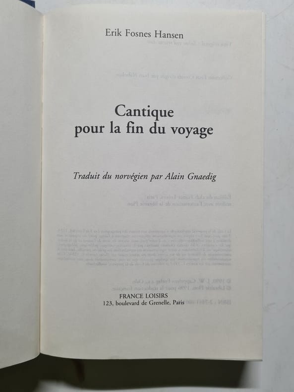 France loisirs 1996 500 pages in8. 1996. Relié jaquette. 500 pages. Traduction : Alain Gnaedig. En fin de volume 9 pages illustrées sur le livre et l'auteur. Qui étaient les musiciens qui selon la légende jouèrent des valses des ragtimes et des cantiques pour que les passagers de première classe ne s'inquiètent pas - lors que le Titanic coulait ? Par le biais de sept musiciens fictifs Erick Fosnes Hansen raconte l'Europe de la culture et de l'art. sept destins emblématiques comme autant de résumés de la comédie humaine : Jason Coward le chef d'orchestre londonien incarnation d'une Angleterre triomphante ; Alex le premier violon qui a fuit St-Pétersbourg ; James Reel pur Irlandais qui se veut d'avantage marin qu'altiste ; Georges Donner le violoncelliste un Français lettré raffiné ironique ; spot le pianiste allemand cocaïnonmane qui a abandoné femme et enfant ; David Bliernstern très jeune viloniste qu'une histoire de c ur a poussé à fuir Vienne et Giovanni Pétronio Vitellotest le contrebassiste hanté par la magie de la musique et le jeu des apparences.Pour tous ces hommes le destin a fixé un rendez-vous avec la mort : le 15 avril 1912 quand le navire après avoir heurté un iceberg s'enfoncera dans une mer glacée...Erick fosnes Hansen est né à New York en 1965 de parents norvégiens. A vingt ans il publie son premier roman très remarqué par la critique. Cantique pour la fin du voyage son deuxième roman a été d'emblée un immense best-seller en Norvège en Allemagne et à travers le monde. cantique pour la fin du voyage n'est pas seulement un grand roman classique sur l'expérience de fla maturité de l'amitié et de l'amour de l'âge adulte et du désastre...c'est aussi un portrait très moderne de la beauté et de l'autodestruction dans la culture européenne