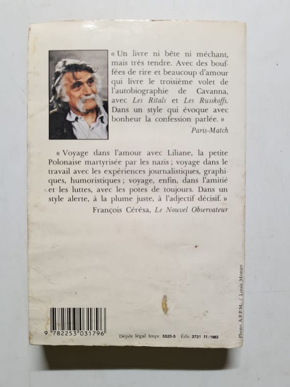 Librairie Générale Française (LGF) 1983 352 pages 1983. 352 pages. Un livre ni bête ni méchant mais très tendre. Avec des bouffées de rire et beaucoup d'amour qui livre le troisième volet de l'autobiographie de Cavanna avec Les Ritals et Les Russkoffs. Dans un style qui évoque avec bonheur la confession parlée. Voyage dans l'amour avec Liliane la petite Polonaise martyrisée par les nazis ; voyage dans le travail avec les expériences journalistiques graphiques humoristiques ; voyage enfin dans l'amitié et les luttes avec les potes de toujours. Dans un style alerte à la plume juste à l'adjectif décisif