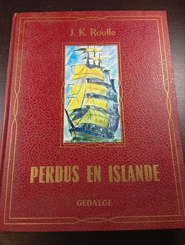 1920 Librairie Gedalge, Paris (sans date)1920. - Grand in-8 (20x26,5cm) cartonnage rouge et or de l'éditeur illustrée d'un large et très élégant décor floral. Titre et double filets dorés, vignette illustrée en couleurs contrecollée sur le premier plat. 126 pages + table. Illustrations nb in et hors-texte de Lerolles.. Aventures de pêcheurs en mer D'Islande., peche à la morue, geyzers