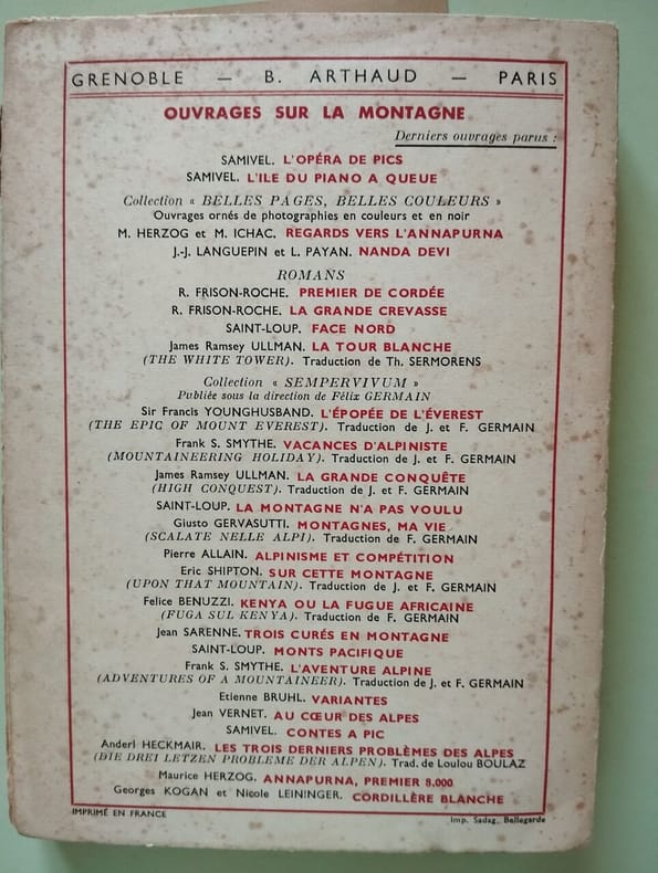 41. edition Arthaud 1942. Collection " Sempervivum ", 1942. Broché, jaquette manquante. 155 pages. Illustrations hors-texte. 14eme mille inscrip sur la couverture. Préface de Maurice Herzog. interieur tres bon, photos possibles