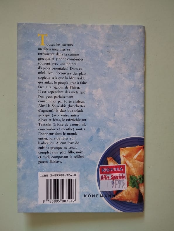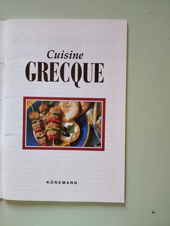 Athènes, Fotorama éd., 1993, in-8, Br., cartonnage souple avec rabats, Couv. photo coul. éd., 166 pp., nb. photos coul., Tables des matières, Introduction, Glossaire, Index. Ce livre rassemble plus de 150 recettes choisies dans diverses régions de Grèce et contient plus de 90 illustrations en couleurs. Toutes ces recettesfameuses et ces saveurs de terroir, présentées dans une langue simple, vous enchanteront et transporteront votre table dans la campagne grecque. TBE