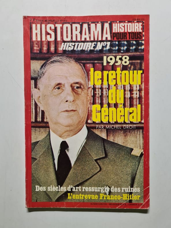 Sommaire : Ce quart de siècle (14) 1958 le retour du Général - il y a 900 ans à Canossa - les spectacles et l'histoire - la fabuleuse aventure du roi de lîle de Pâques - Budapest pendant le siège de 1945 - le premier cadeau de Napoléon à Marie Louise - portrait du mois Pham van Dong - l'entrevue Franco-Hitler - mémoires d'un prince français sur la guerre de Sécession - des siècles d'Art ressurgis des ruines - les armes secrètes de Hitler pouvaient elles sauver le IIIe Reich ? - la véritable histoire du Radeau de la Méduse - les curiosités du calendrier républicain. Classification Dewey : 944-Histoire de France varia
