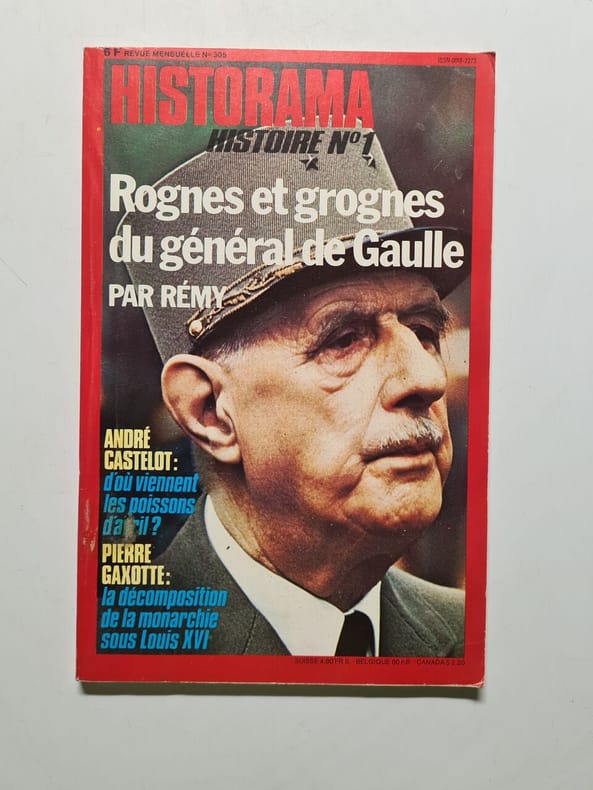 "Historama. 1977. In-8. Broché. Etat d'usage, Couv. légèrement passée, Coiffe en pied abîmée, Papier jauni. 128 pages. Nombreuses photos en noir et blanc, dans le texte. Inclus des copies de coupures de presses concernant De Gaulle ( ""Une grande controverse : Comment de Gaulle s'est-il conduit à Douaumont?""). . . . Classification Dewey : 940.53-Seconde Guerre mondiale 1939-1945"