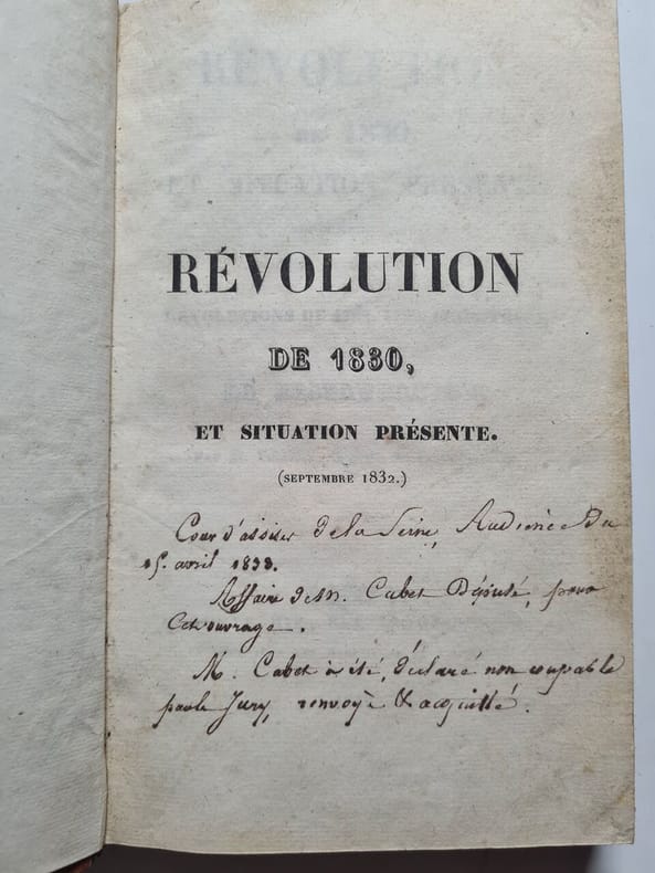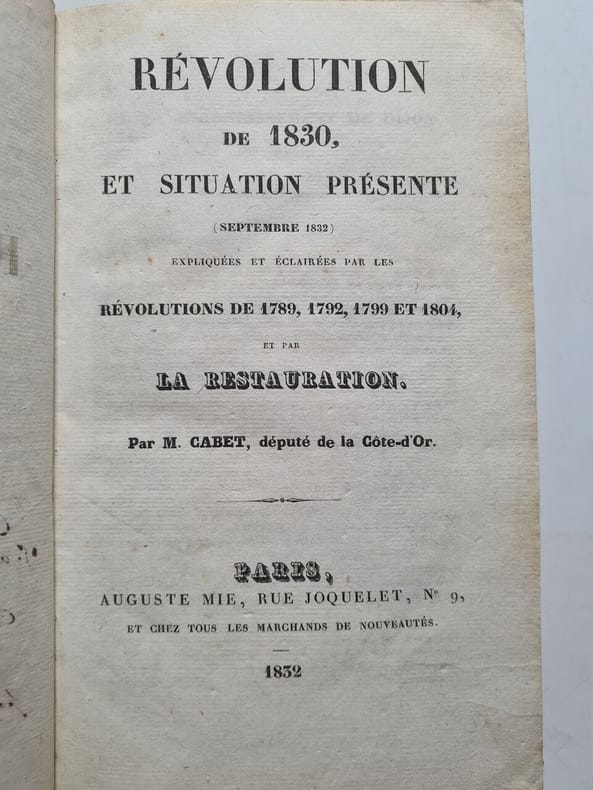 Edition originale, en un seul volume. Cet ouvrage assez confus valut au socialiste Cabet, futur fondateur de l'"Icarisme", une condamnation en correctionnelle. En 1830, Etienne Cabet (1788-1857) avait naturellement joué un rôle dans l'état-major dirigeant l'action révolutionnaire en 1830, et avait été élu dès le 29 juillet membre de la première municipalité insurrectionnelle dans le quartier du Luxembourg. Comme beaucoup d'amis républicains, il accepta la monarchie constitutionnelle présentée par les partisans du duc d'Orléans. - - VENTE PAR CORRESPONDANCE UNIQUEMENT - LIEN DE PAIEMENT, NOUS CONSULTER.