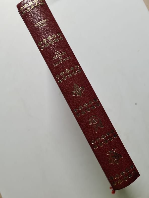 Oeuvres complètes d’Alexandre DUMAS. Publication du journal LE SIECLE. Un volume in 8, 295x210mm, demi -cuir marron titre, filets dorés Le chevalier de Maison Rouge 112 pages, texte sur 2 colonnes. Le Comte de MONTE -CHRISTO supplément au journal Le Siècle du 28 Septembre 1845 en bandeau en marge supérieure jusqu’à la page 145 du 1 février 1846 Cette mention disparaît à cette date.403 pages, texte sur 2 colonnes. Rousseurs habituelles. A la suite François PICAUD 5 pages, « les quelques lignes que nos lecteurs vont trouver à la suite de l’admirable roman MONTE CHRISTO, serviront peut être, ainsi dire, de pièces justificatives à cet ouvrage. Donner une réalité saisissante à une composition toute merveilleuse, prouver la vérité de ces faits providentiels, montrer que ces scènes dramatiques ont eu des témoins, c’est doubler l’intérêt qui s’est attaché à l’œuvre et lui donne un titre impérissable à la curiosité publique » ce texte disparait dans toutes les éditions suivantes. Edition originale avant l'ajout des gravures. Fort rare (L86 E29G)