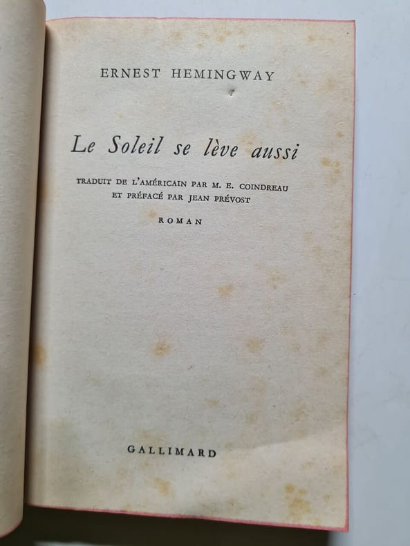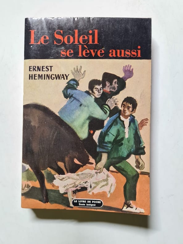 Imprimerie Nationale, André Sauret, Éditeur, coll. « Oeuvres complètes d’Ernest Hemingway » 1964 Volume 3 complet du roman “le soleil se lève aussi”. In-4 broché sous couverture rempliée avec chemise rigide et dos havane titré, étui toilé. 28 cm sur 22. 277 pages. Pages non coupées. Lithographies originales en couleurs hors-texte de Garbell. Chemise avec dos fendillé sur quelques centimètres et léger accroc au titre, intérieur frais, bon état d’occasion.