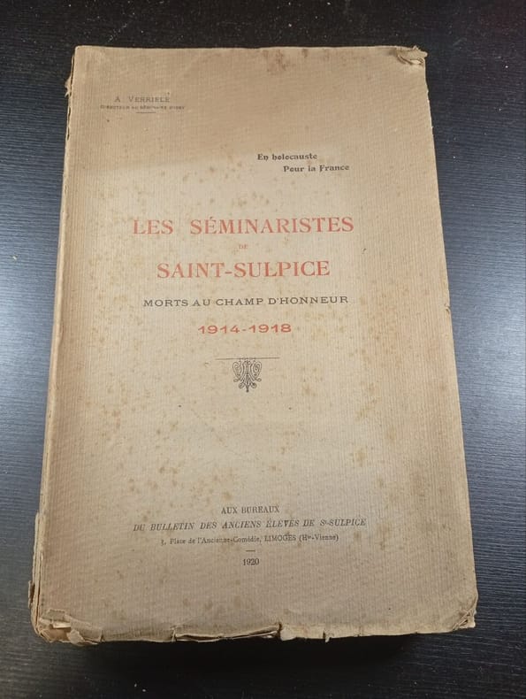 AUX BUREAUX DES ANCIENS ELEVES DE ST-SULPICE. 1920. In-8. Broché. Etat d'usage, 1er plat abîmé, Mors fendus, Non coupé. XII + 495 pages. Nombreuses planches de photos en noir et blanc. Une déchirure et un tampon sur le 1er plat de couverture.. . . . Classification Dewey : 940.3-Première Guerre mondiale 1914-1918