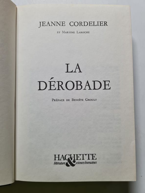 Hachette Sans date. La Dérobade est un roman autobiographique dans lequel Jeanne Cordelier raconte sans filtre ses années de prostitution décrivant l'horreur d'une servitude humiliante où l'on exploite la naïveté et où l'on monnaie l'amour