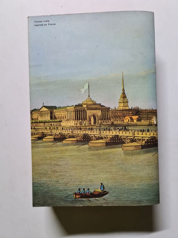 Ensemble complet des trois volumes le constituant. La Guerre et la Paix narre l’histoire de la Russie à l’époque de Napoléon Ier (notamment la campagne de Russie en 1812). La richesse et le réalisme de ses détails ainsi que ses nombreuses descriptions psychologiques font qu’il est souvent considéré comme un roman majeur de l’histoire de la littérature. Tolstoï y développe une théorie fataliste de l’histoire, où le libre arbitre n’a qu’une importance mineure et où tous les événements n’obéissent qu’à un déterminisme historique inéluctable. Guerre et Paix a engendré un nouveau genre de fiction. Bien qu’aujourd’hui considéré comme un roman, cette œuvre a cassé de si nombreux codes du roman de son époque que de nombreux critiques ne le considérèrent pas comme tel. Tolstoï considérait lui-même Anna Karénine comme sa première tentative de roman, au sens où les Européens l’entendaient. Guerre et Paix fut à l’époque de sa publication un immense succès, bien que Tolstoï ne s’y attendît pas, ce dernier pensant même que son oeuvre passerait inaperçue. Très légères altérations affectant les reliures. Papier légèrement oxydé. Quelques rares autant que discrètes rousseurs dans les corps d'ouvrages. Du reste, bonne condition.