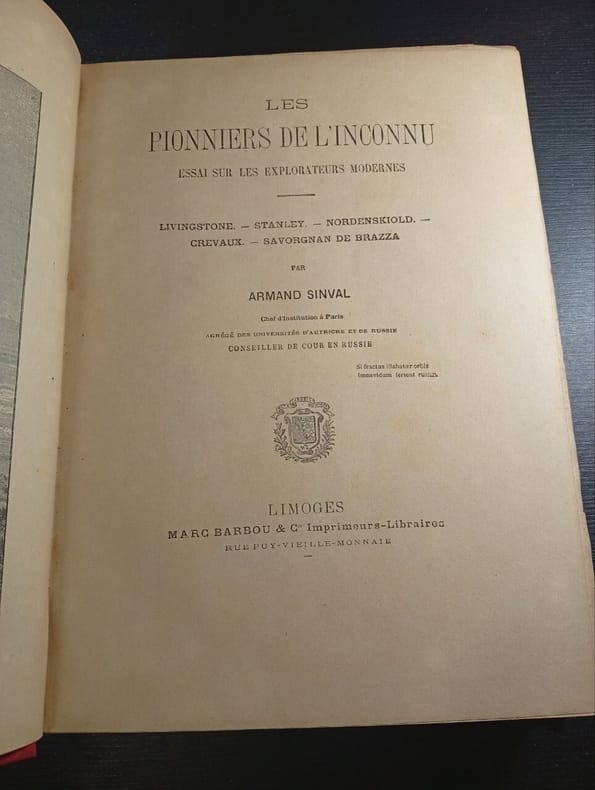 Un volume in-4°, reliure rigide éditeur, percaline rouge dorures , le premier plat présente une scène de naufrage sous les yeux de deux indigènes . L’ouvrage, qui s’ouvre sur un frontispice représentant Savorgnan de Brazza, compte 336 pages et contient de nombreuses illustrations en noir. On y trouve un ton relativement inhabituel dans ce type d’ouvrage destiné au grand public (souvent celui des collégiens et lycéens): précision de la documentation, réflexions approfondies sur la psychologie des explorateurs choisis. Les personnages de Nordenskiold et Crevaux, moins connus que d’autres, donnent lieu à de nombreuses pages passionnantes. Le dos de cette reliure éditeur est légèrement défraîchi mais la qualité de son 1er plat et son aspect général (compacité, charnières et mors intacts) méritent la catégorie TRES BON ETAT.
